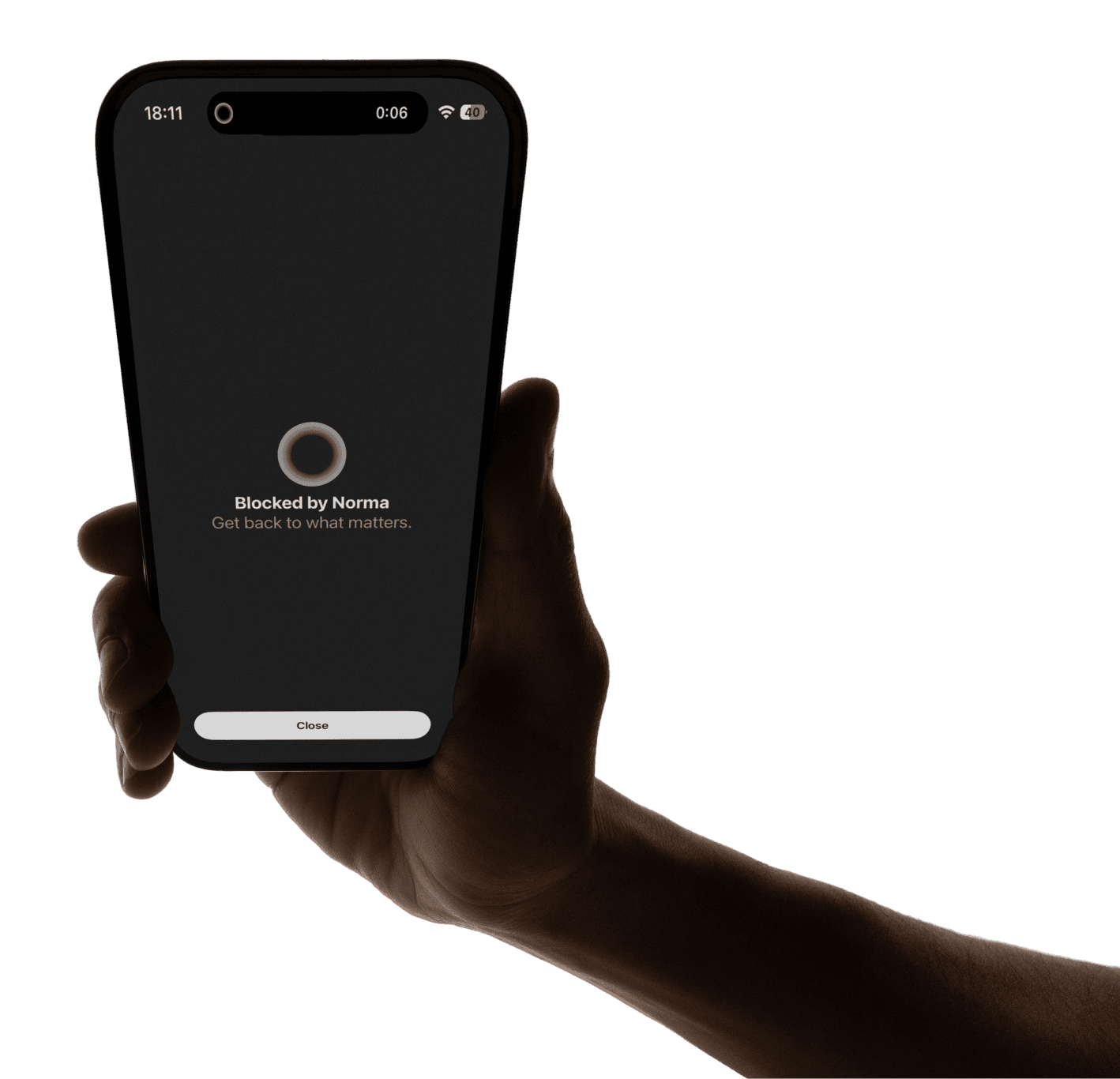 Norma blocks the apps you selects and their notifications. When you tap your iPhone on the Unit Disc, the apps you chose become inaccessible and their notifications stop. Tap again to restore access.